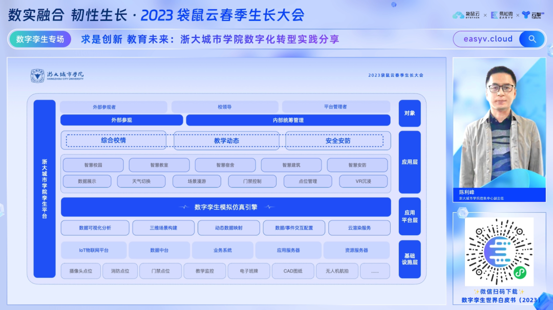 教育数字化飞速发展,“互联网+教育”改革风头正劲,会上,浙大城市学院信息中心副主任陈利锋带来「求实创新,教育未来」的主题分享,包含当下教育行业前沿趋势洞察、校园孪生平台架构以及学院智慧教育最佳实践等丰富内容。陈利锋表示,未来浙大城市学院将携手易知微持续深入数字孪生校园领域,共同致力于实现智慧校园的“双碳校园”、“服务深化”、“