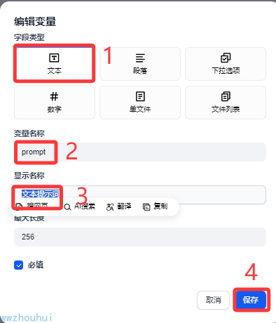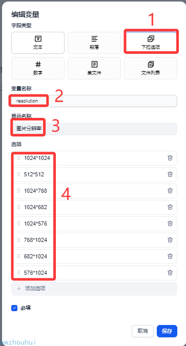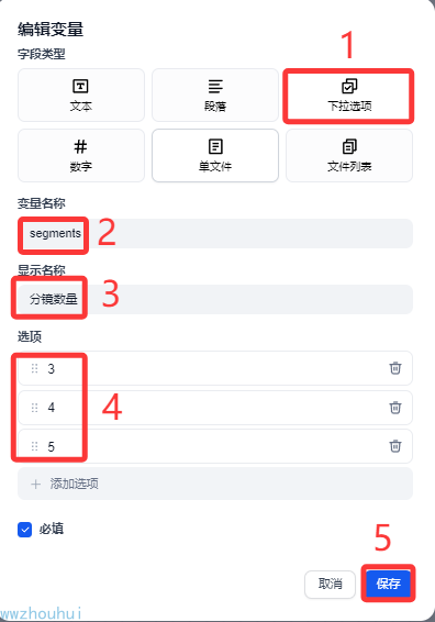 首选我们先界说一个开始节点,这个开始几点须要设置多个输入字段,一个是提示词,别的一个是绘本的分境数量。思量输入方便,分境数量我们使用下拉列表情势展示。