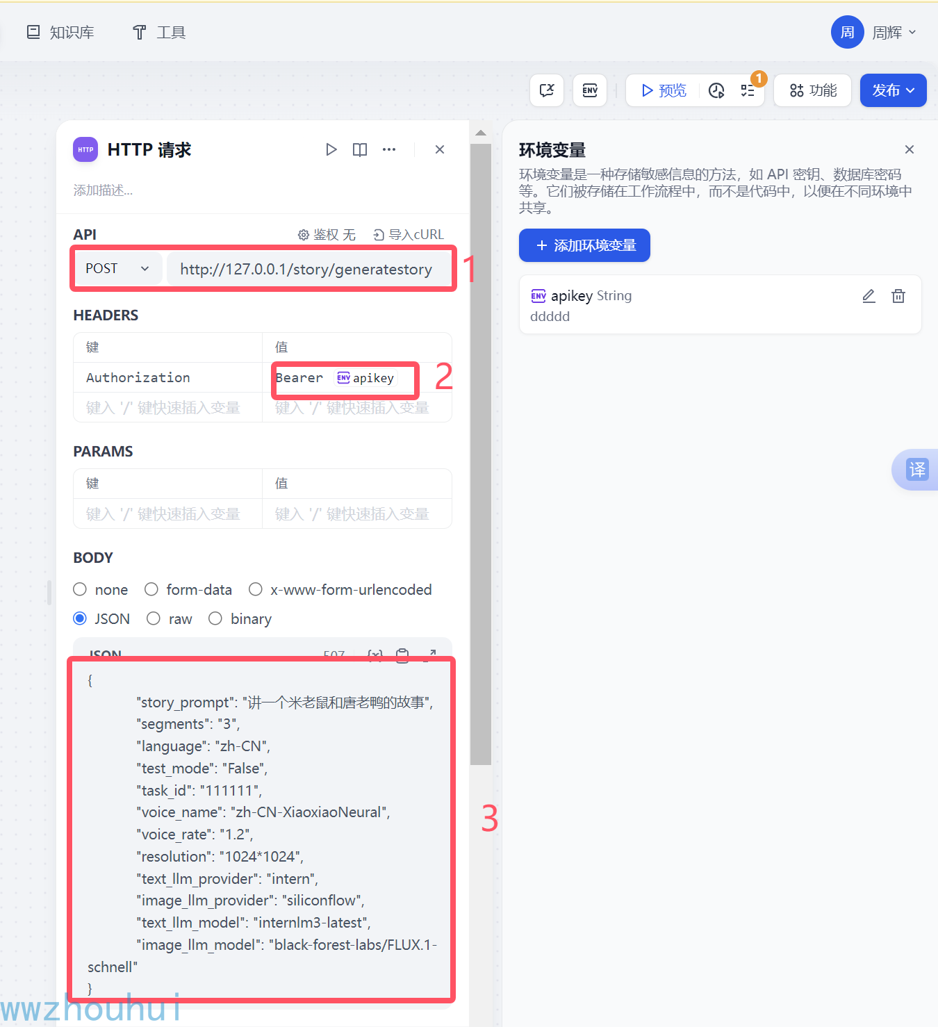 这个http哀求接口 提交方式post 地点我这里用局域网地点 http://192.168.1.3:8085/story/generatestory (待会测试也用当地电脑)