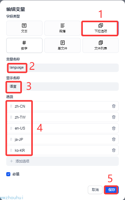 language:语言 这里我们做成下拉的选项 现在支持的语音是 简体中文、繁体中文、美式英语、日语、韩语等5个国家的语言。