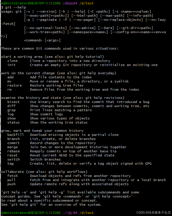 git status等下令给出的信息似乎都有个什么什么tree,偶然间不知道是啥意思。英文语境下似乎不这么叫吧,work zone,大概啥,似乎是叫什么什么树。以是把工作区称为文件树大概贴合它的现实环境吧。git的下令在windows上也可以用git --help。然后常用的下令都有表明,和linux上差不多。而且这个工作区,看git上的提示信息似乎都是说working tree,比如下图中的参数表明中,也多提到working tree,而不是工作区,翻译过来应该叫工作树。在windows上不能用man git,而能用下面列出的git help -a