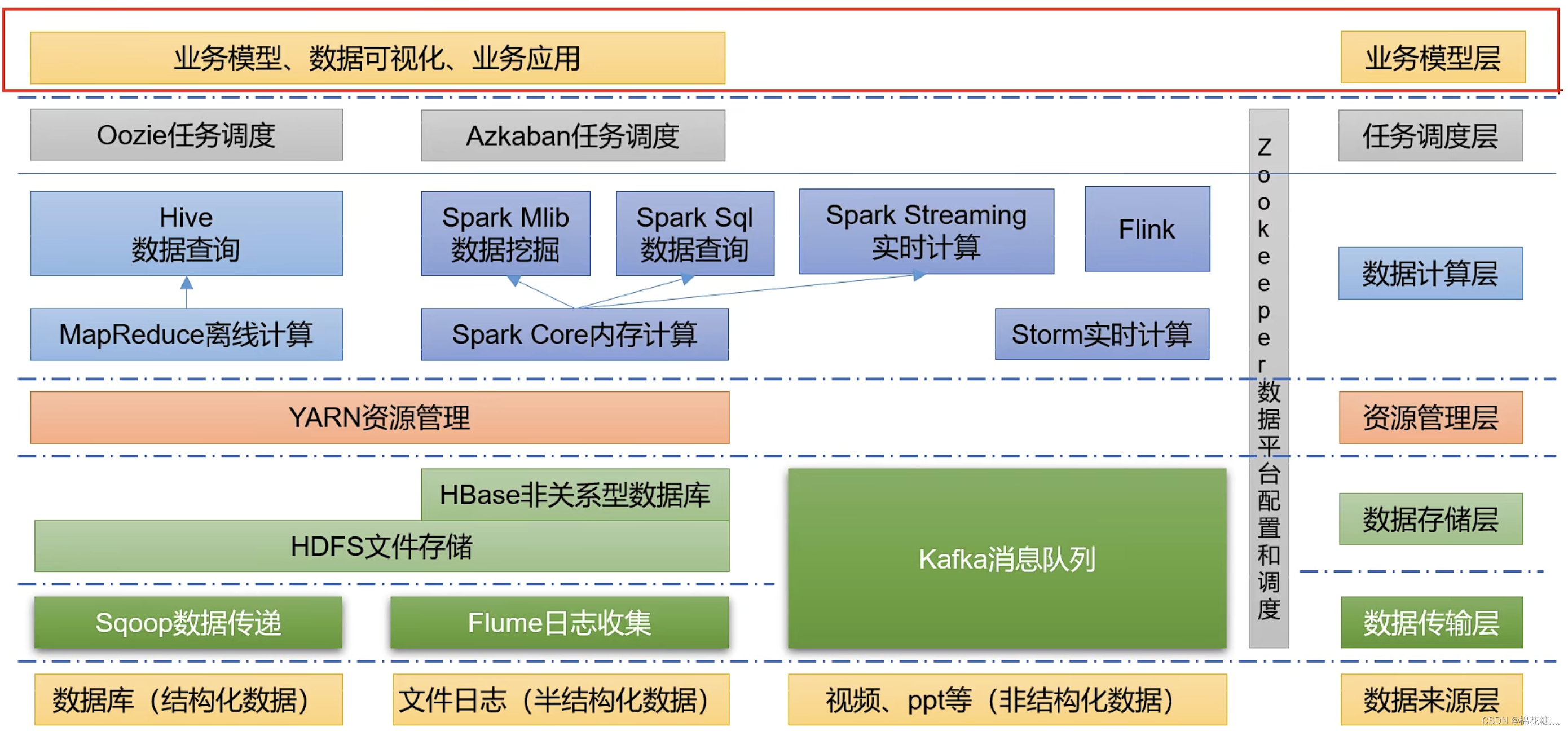 Hbase:HBase 是一个分布式的、面向列的开源数据库。HBase 不同于一般的关系数据 库,它是一个适合于非结构化数据存储的数据库。