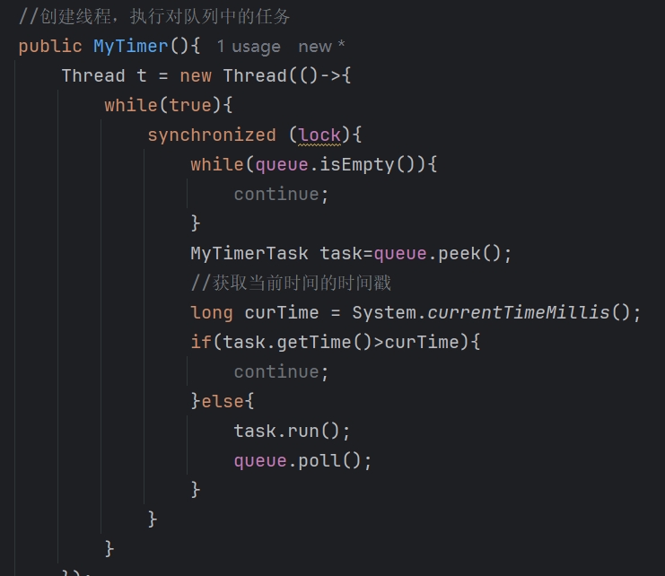 - //创建线程,实行对队列中的任务 public MyTimer() { Thread t = new Thread(() -> { while (true) { try { synchronized (lock) { while (queue.isEmpty()) { lock.wait(); } MyTimerTask task = queue.peek(); //获取当前时间的时间戳 long curTime = System.currentTimeMillis(); if (task.getTime() > curTime) { lock.wait(task.getTime() - curTime); } else { task.run(); queue.poll(); } } } catch(InterruptedException e){ throw new RuntimeException(e); } } }); t.start(); } //实现schedule方法,将任务放入队列当中 public void schedule (Runnable runnable,long time){ synchronized (lock) { queue.offer(new MyTimerTask(runnable, time)); lock.notify(); } } }
