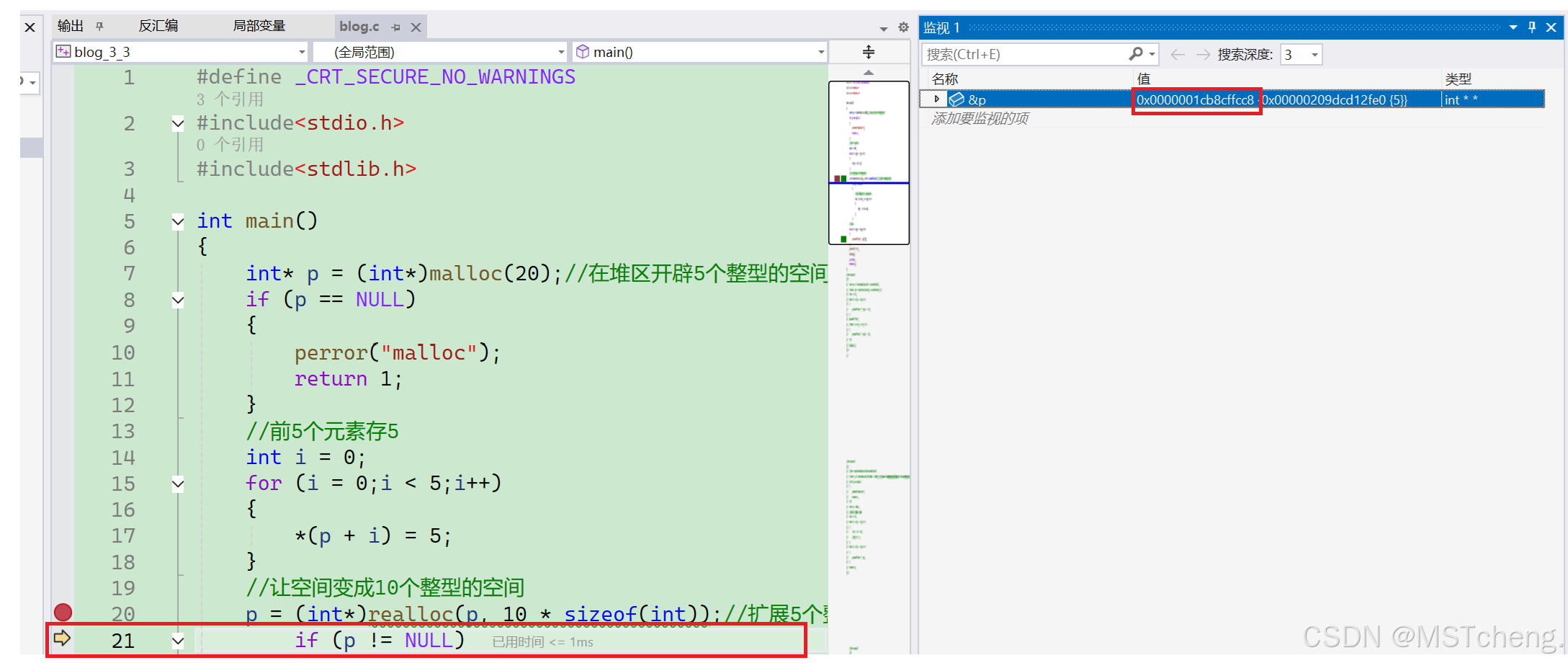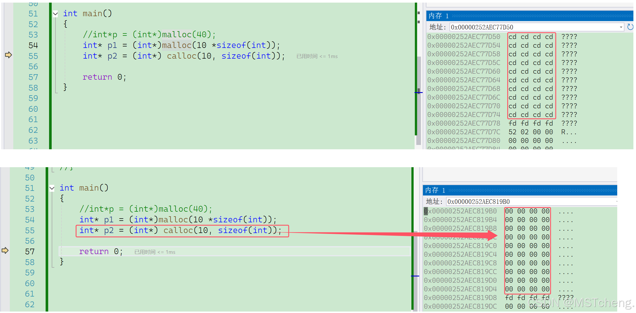 我们可以很直观的看到malloc开辟空间后打印出的值是随机值,calloc函数开辟的空间打印出的全为0,即已经初始化了。我们再调试起来让各人看看他们的区别: