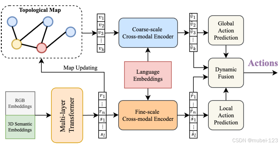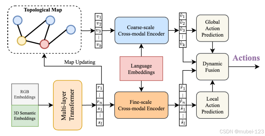 (5)粗尺度多模态留意力模块 + 全局动作推测模块:整合对齐备局视觉特性和文本特性,并得到全局推测动作;