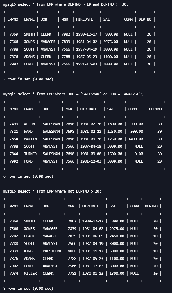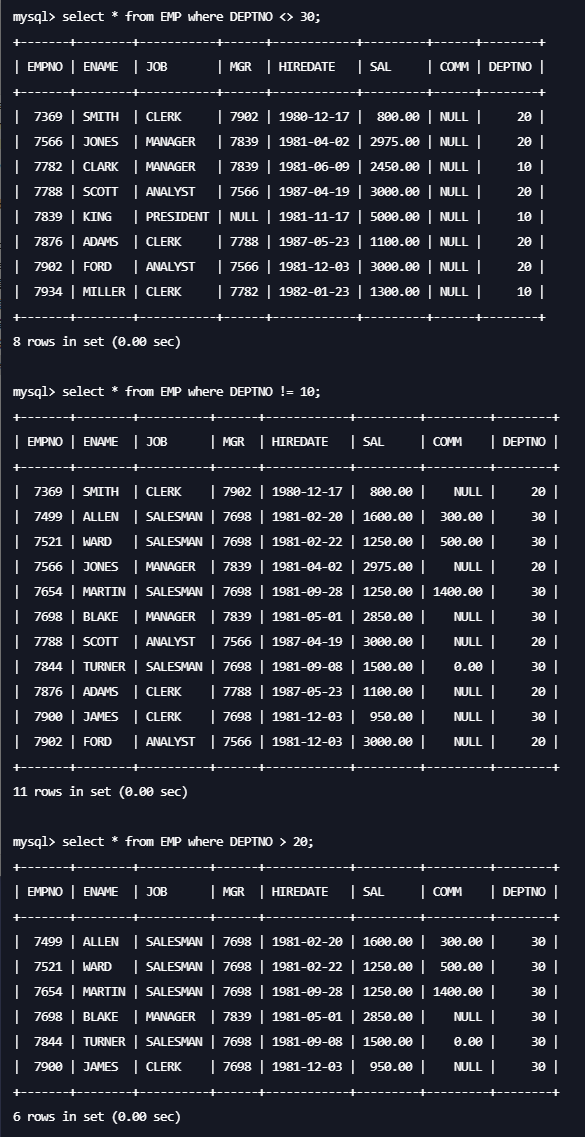 - select * from EMP where DEPTNO > 10 and DEPTNO != 30;