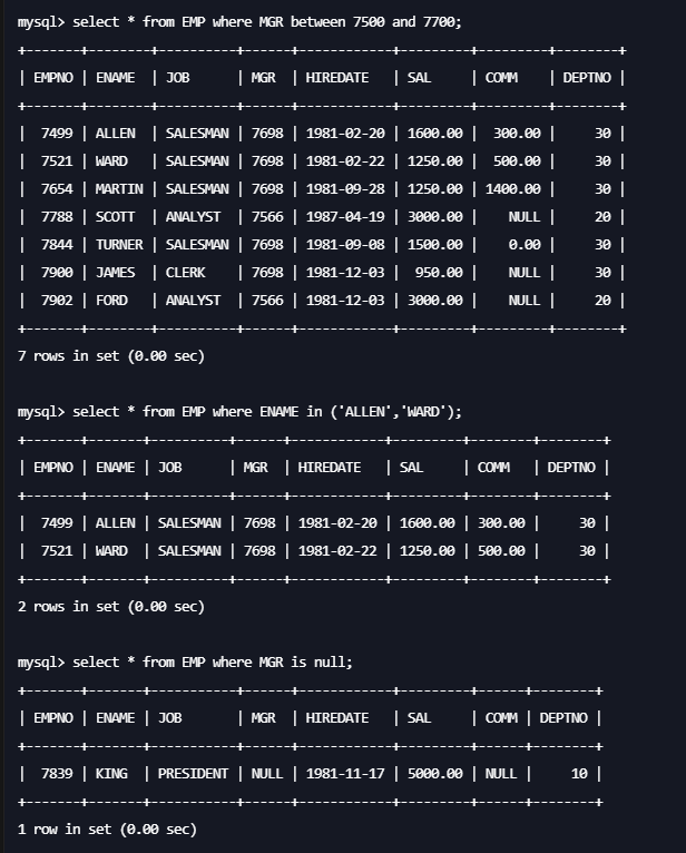- select * from EMP where ENAME in ('ALLEN','WARD');