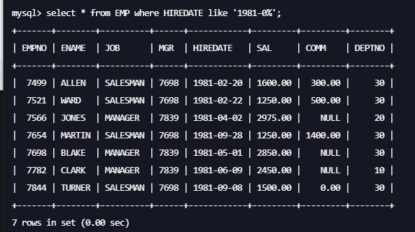 当查询条件为0和1时,SQL会发生隐式转换。0会转换为false,而1即为true。- select * from EMP where HIREDATE like '1981-0%';