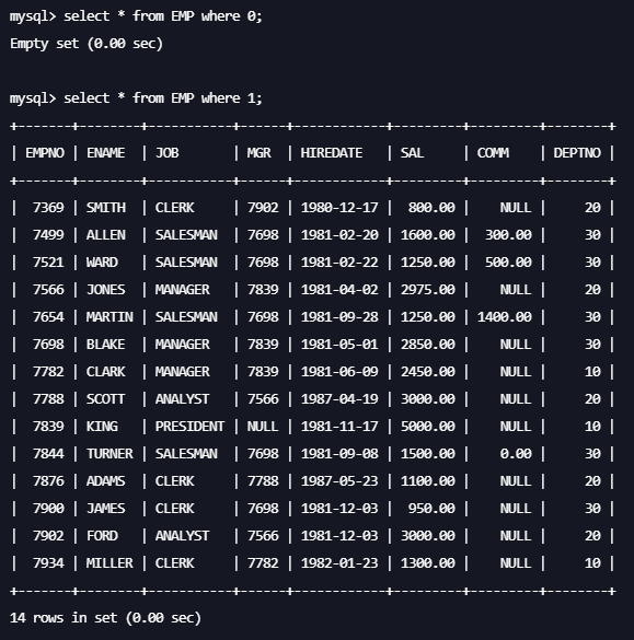复制代码 当条件为false时,返回的结果集为空,因为表中没有符合条件的数据- select * from student where 0;