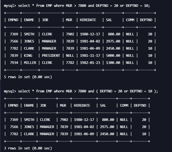 查询EMP,结果集按照领导工号MGR升序,如果存在同相的MGR再按照COMM降序排序- select * from EMP where ENAME regexp 'R$';