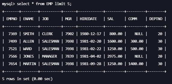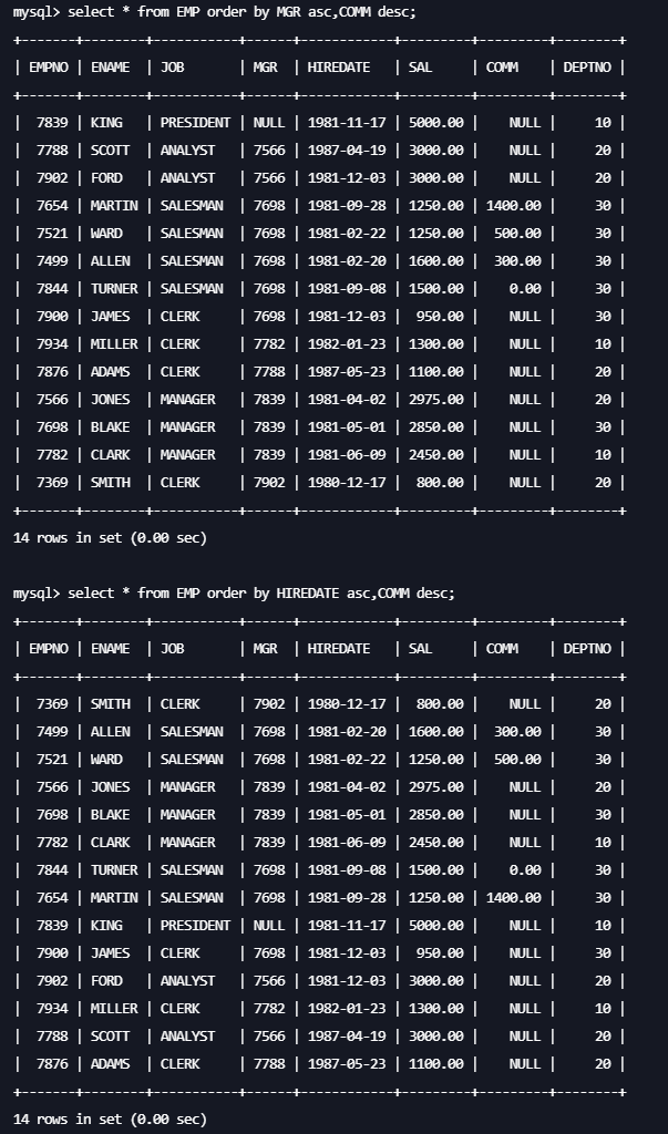 ORDER BY 用于对结果集按照多个或一个列进行排序- select * from EMP where ENAME regexp '^A';