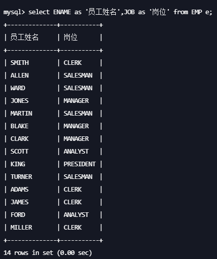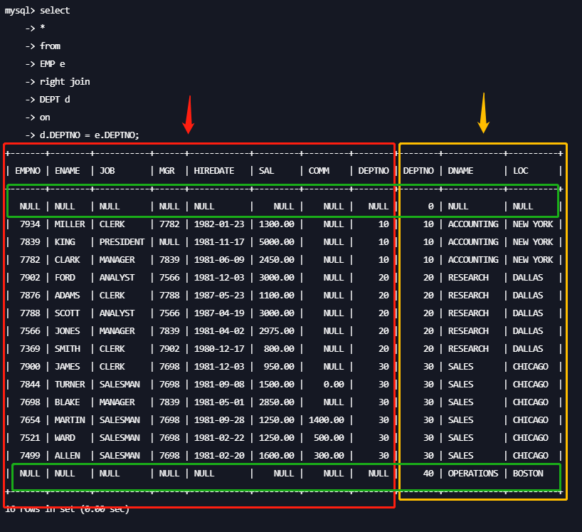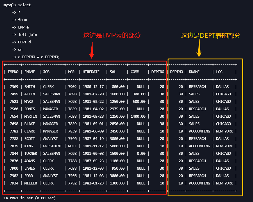 用于合并多个select 语句的结果。要注意,多个select 语句必须要拥有相同数量的字段,字段的数据类型也要相似。- select * from EMP e inner join DEPT d;