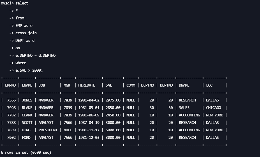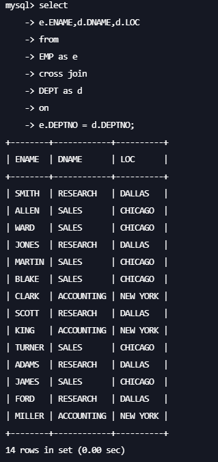 - mysql> select e.ENAME,d.DNAME,d.LOC from EMP as e cross join DEPT as d;