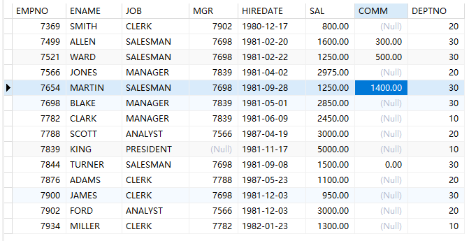 - (7654,'MARTIN','SALESMAN',7698,'1981-09-28',1250.00,1400.00,30),