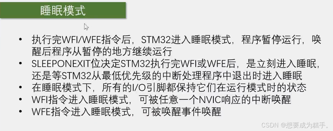 - 关闭外设:体系也可以选择关闭某些不紧张的外设(如未利用的 GPIO、外设接口等),从而进一步低沉功耗。
