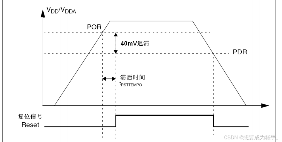 在 STM32 系列中,PWR模块中的 POR 机制通常由电源电压(VDD)稳固后触发复位信号。
