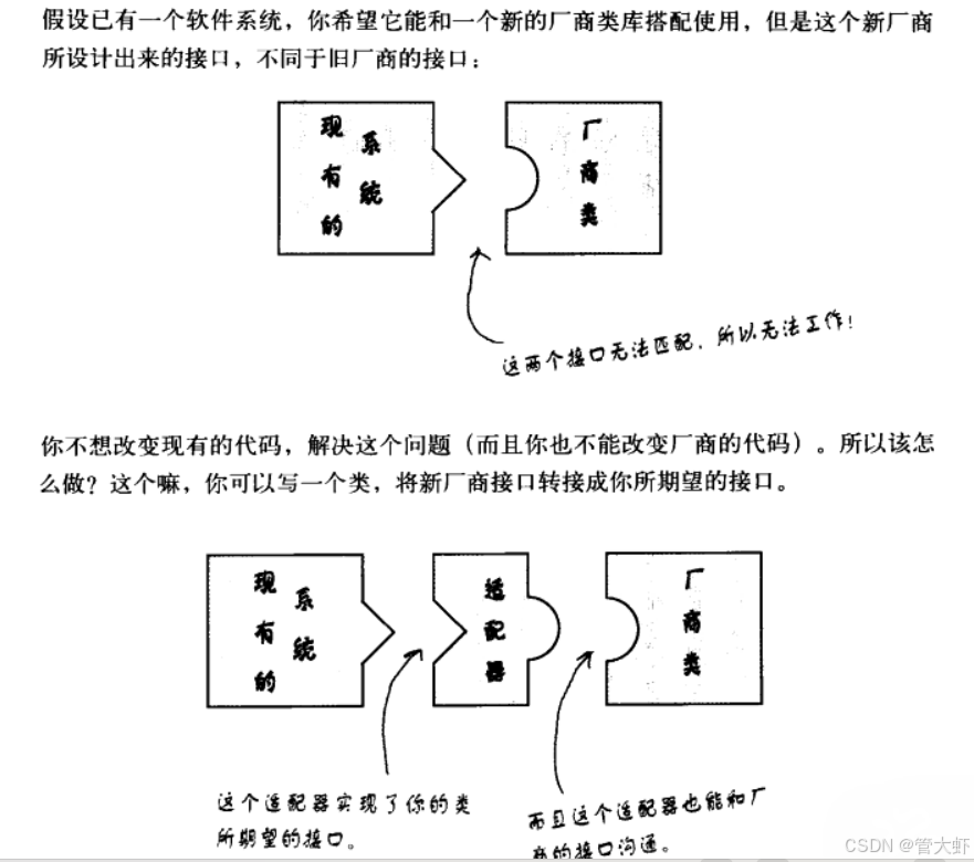 在现实的开辟中,我们大概碰到体系中盼望的接口和第三方提供的接口不划一,这时就可以通过适配器来转化,而不必要更改体系中已有的