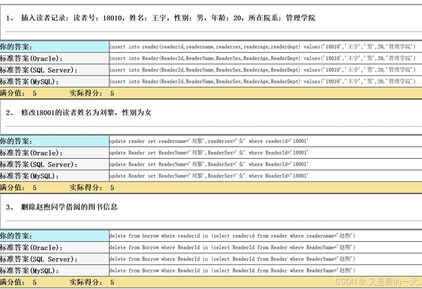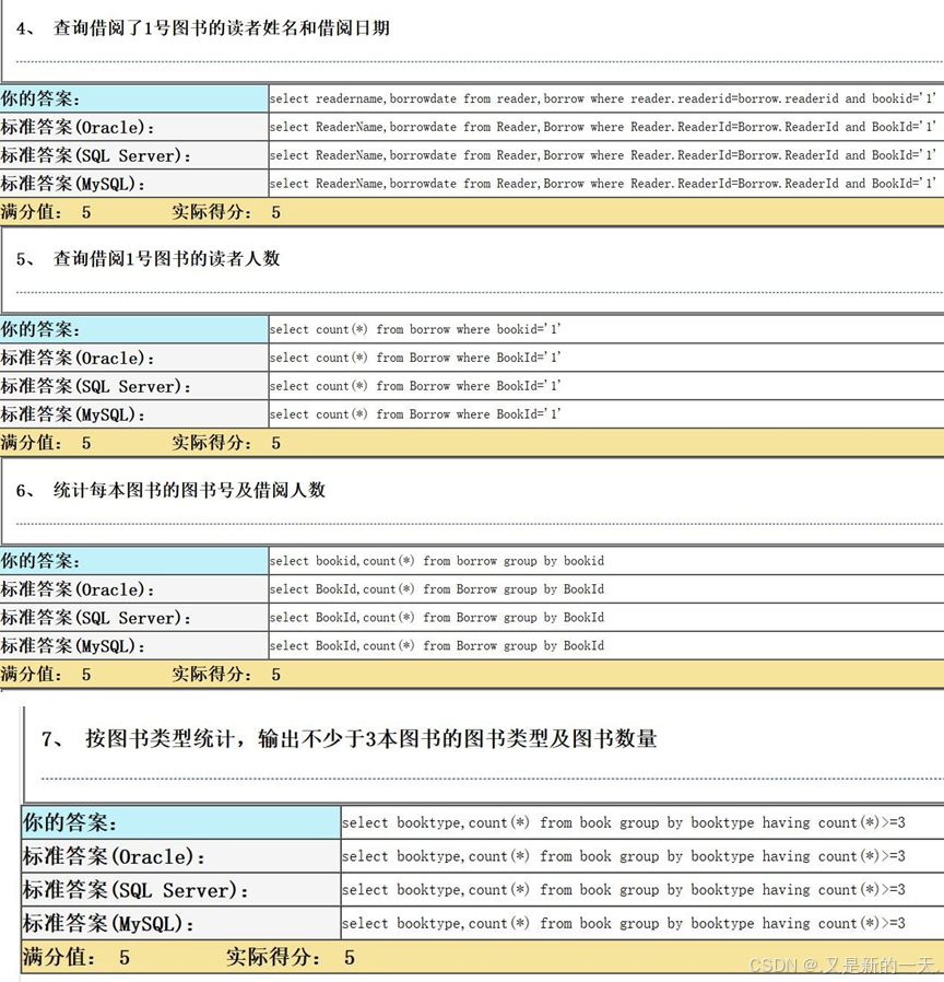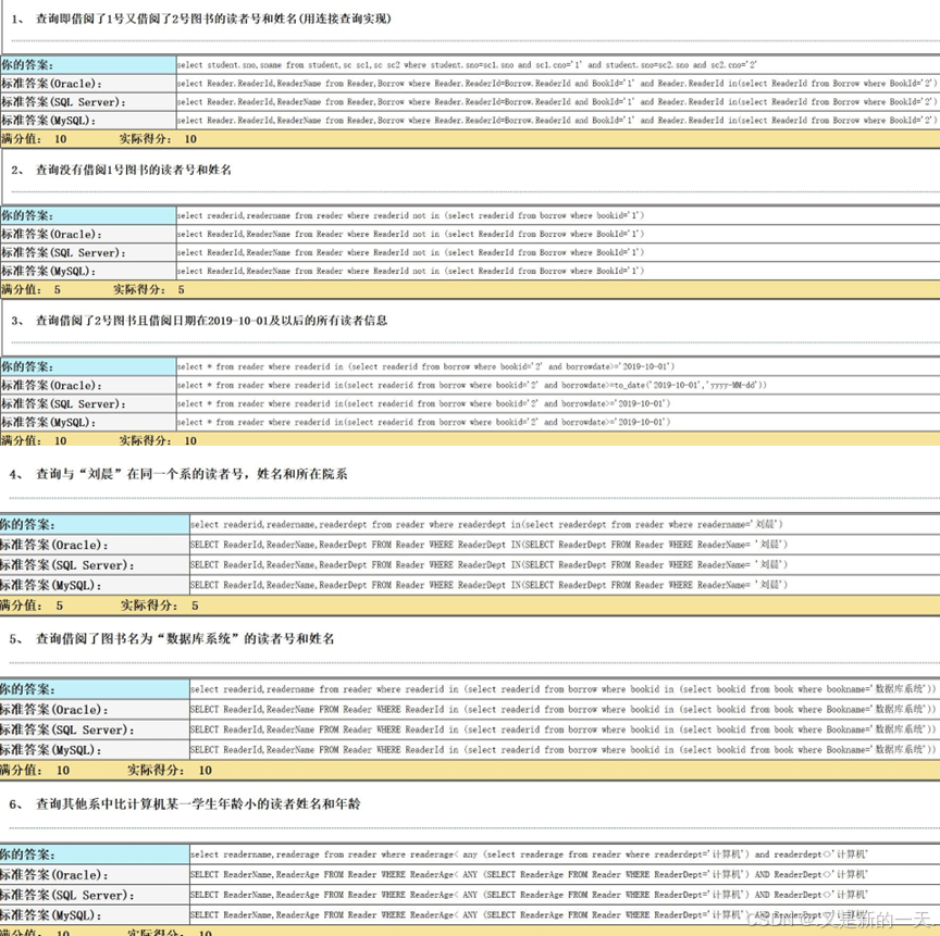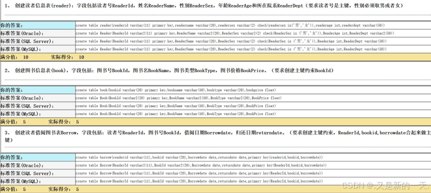 标准答案(MySQL):- create table Borrow(ReaderId varchar(11),