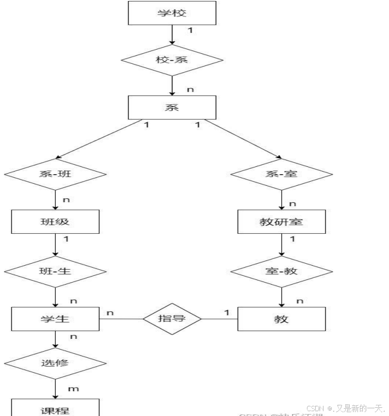 7.学校中有多少系,每个系有多少班级和教研室,每个教研室有多少教员,此中有的教授和副教授每人各带多少研宄生;每个班有多少门生,每个门生选修多少课程,每门课可由多少门生选修。请用 E-R图画出此学校的概念模子。
