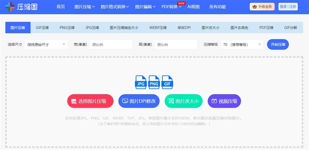 压缩图是一款在线图片编辑工具,提供多种图片处置惩罚功能使用,支持在线处置惩罚JPG、PNG、GIF、WEBP、TIFF、JP2等格式,可以大概处置惩罚最大100M的单张图片大概批量处置惩罚60张图片,有效进步图片处置惩罚的服从。