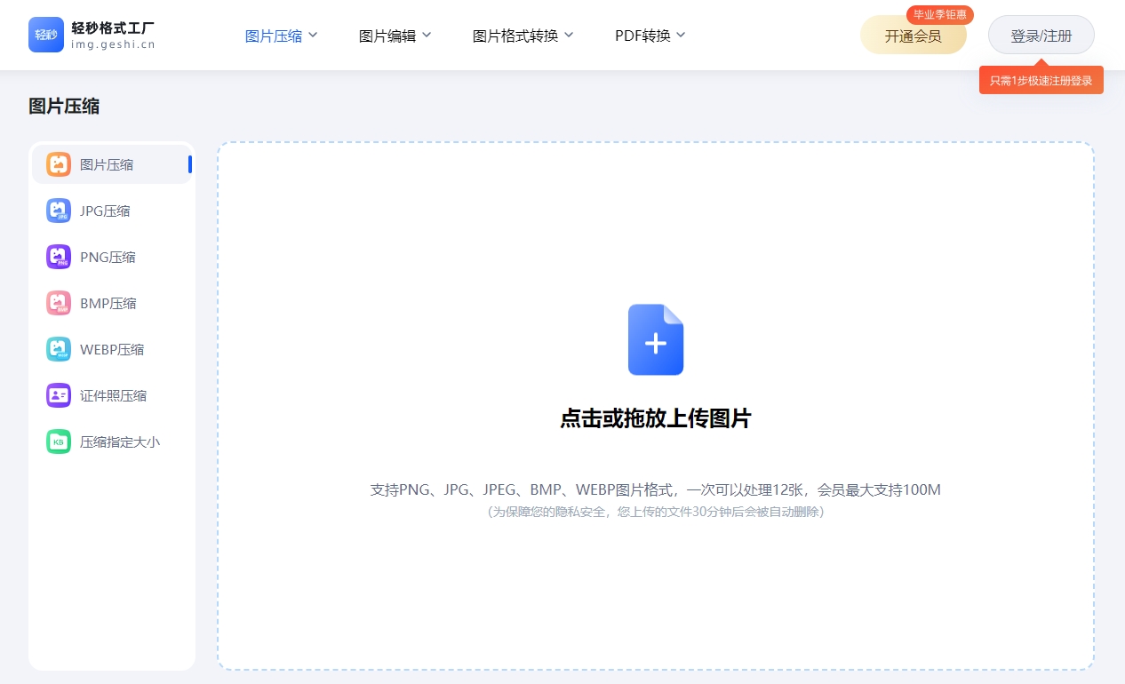 轻秒格式工厂支持多种图片处置惩罚功能,包罗图片压缩、转格式、修改尺寸等,支持PNG、JPG、JPEG、BMP、WEBP图片格式,一次可以处置惩罚12张,会员最大支持100M。