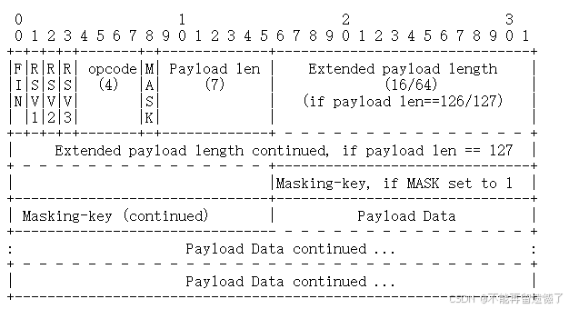 - Masking-key:0大概4字节(32位)全部从客户端传送到服务端的数据帧,数据载荷都举行了掩码操纵,mask 为 1,且携带了4字节的Masking-key。如果 mask 为0.则没有 Masking-key