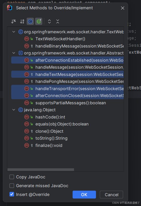复制代码 TextWebSocketHandler 父类中的方法有许多: