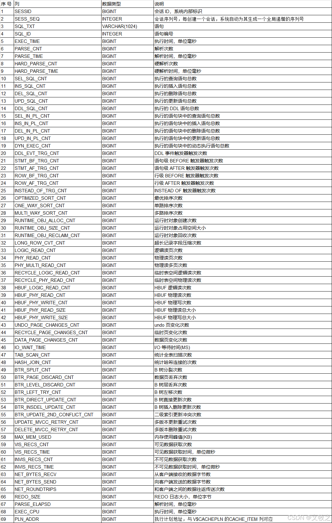达梦数据库的体系视图V$SQL_STAT用于记录当前正在实行的SQL语句的资源开销。这个视图必要启用监控 功能(即ENABLE_MONITOR=1)才开始监控 。针 对 63~68 列 中 的 监 控 项 , 还 需 开 启 参 数