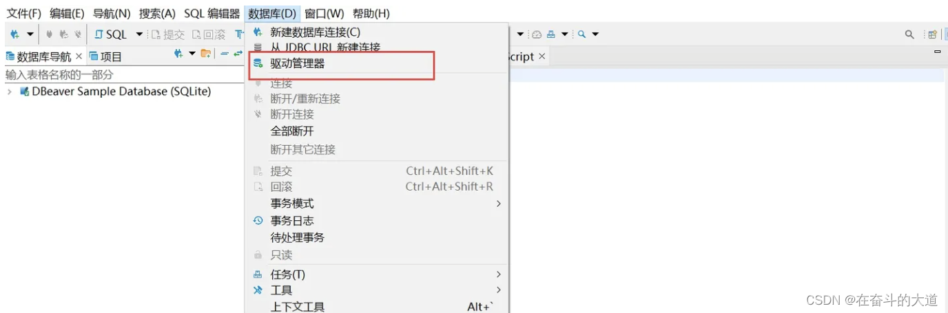 1.打开DBeaver点击数据库>驱动管理;
