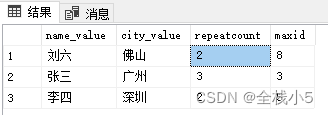 进行两次while遍历,然后将学生重复的都会值,除了编号最大那条记载外,其他重复记载则加序号值并赋值到city_value_temp字段里