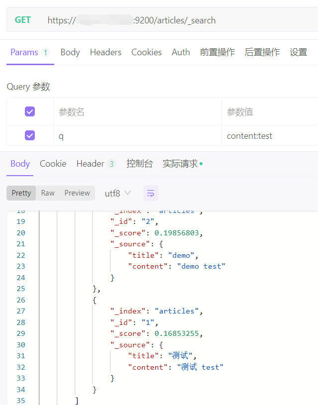 - GET http://ip:9200/indexs/_search?q=content:test # q=查询属性名:查询属性值
